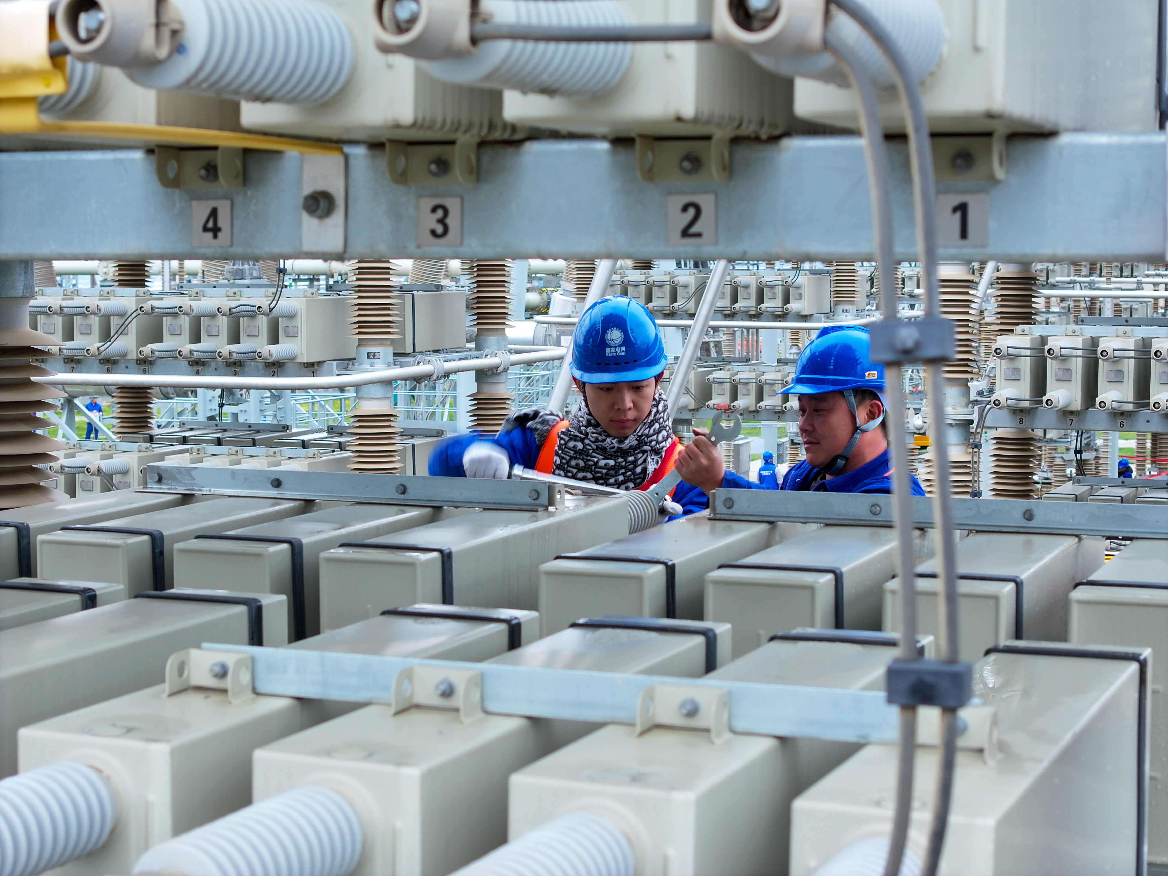 检修人员正在滤波器电容塔上检查螺栓紧固情况。(郑自豪 摄)
