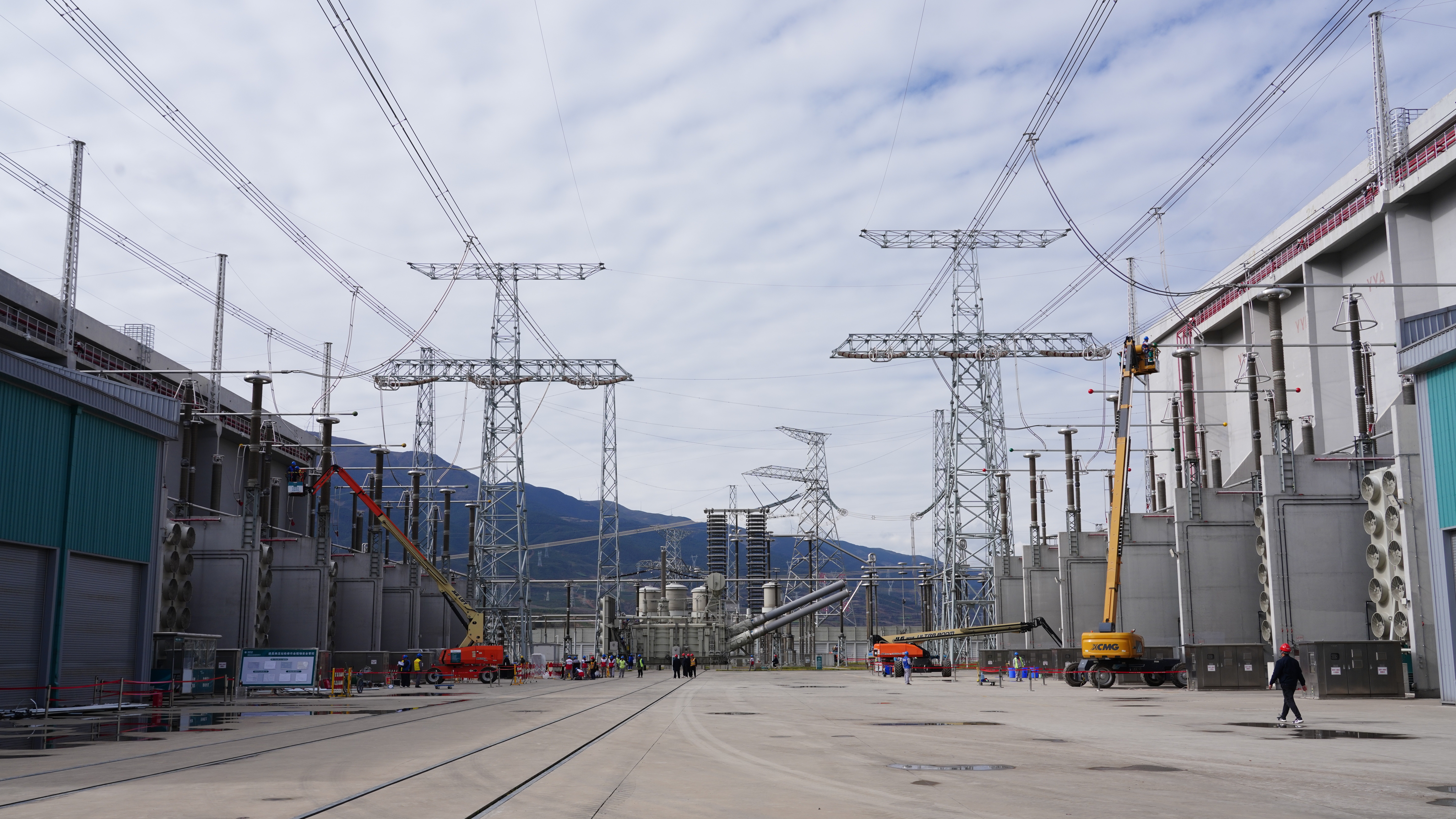 在布拖±800千伏特高压换流站的换流变广场,检修人员正在开展设备检修工作。(郑自豪 摄)