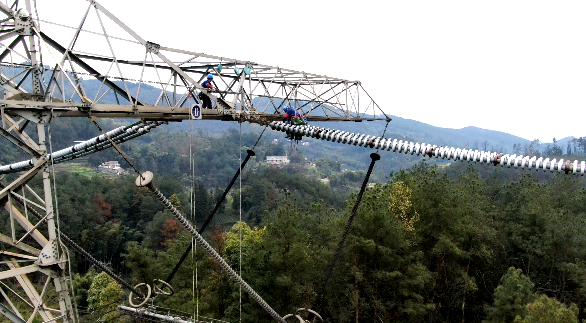 国网四川超高压公司员工正在对向家坝—上海±800千伏特高压直流输电工程四川段开展紧固导线引流板螺工作。(王志奇 摄)