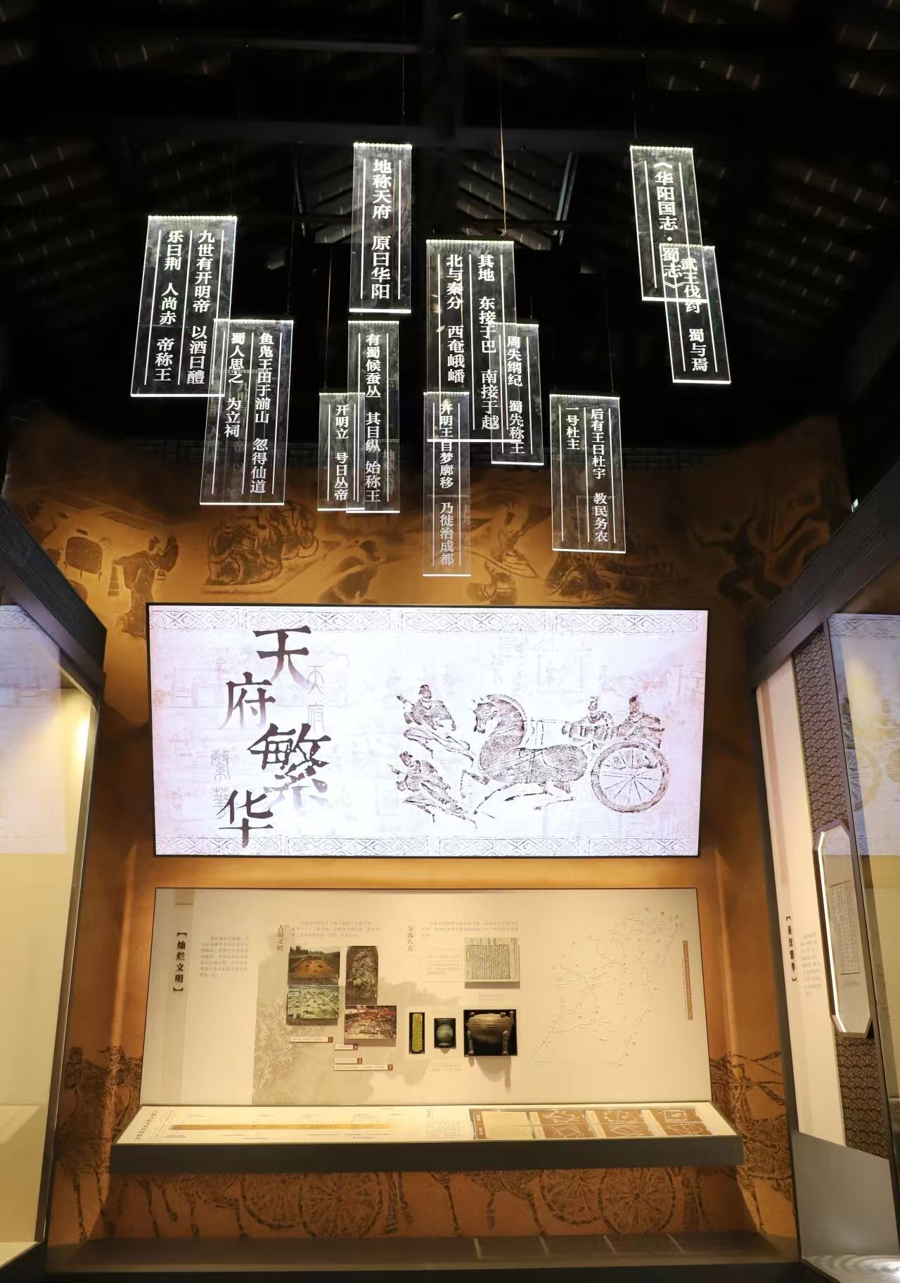 与此同时,《华阳国志》中丰富的神话传说、历史人物、地理风物,为新馆的布展提供了取之不尽的灵感。如:诸葛亮摇扇与司马相如写赋的“才子群像”、《蜀川盛概图》的画卷与先秦时期的成都平原“城市图”、古蜀五王故事传说与李冰治水的事迹……展馆通过艺术吊装、实物浓缩、文字注解、场景复刻等方式,进行了通俗直白又详细全面的解读、介绍。